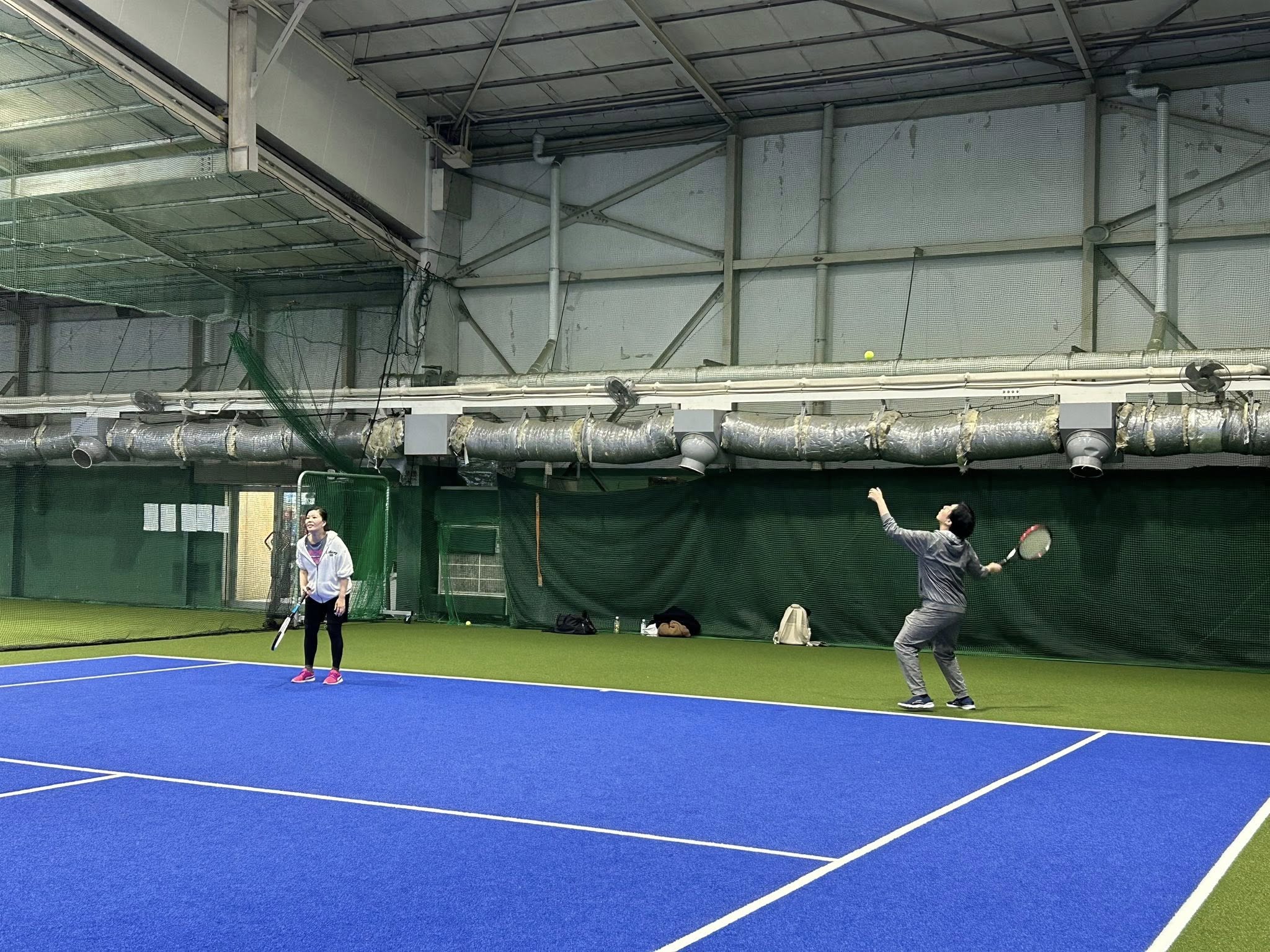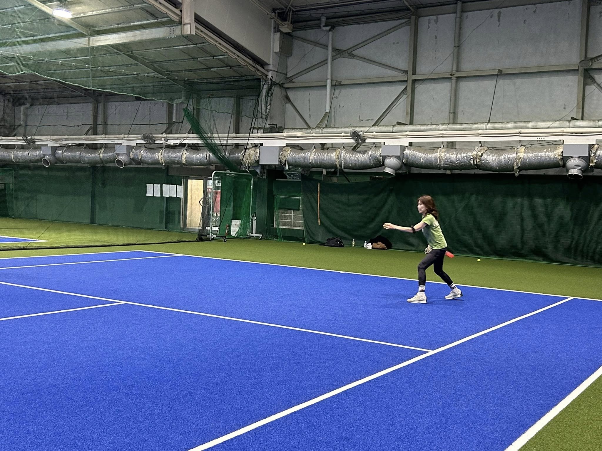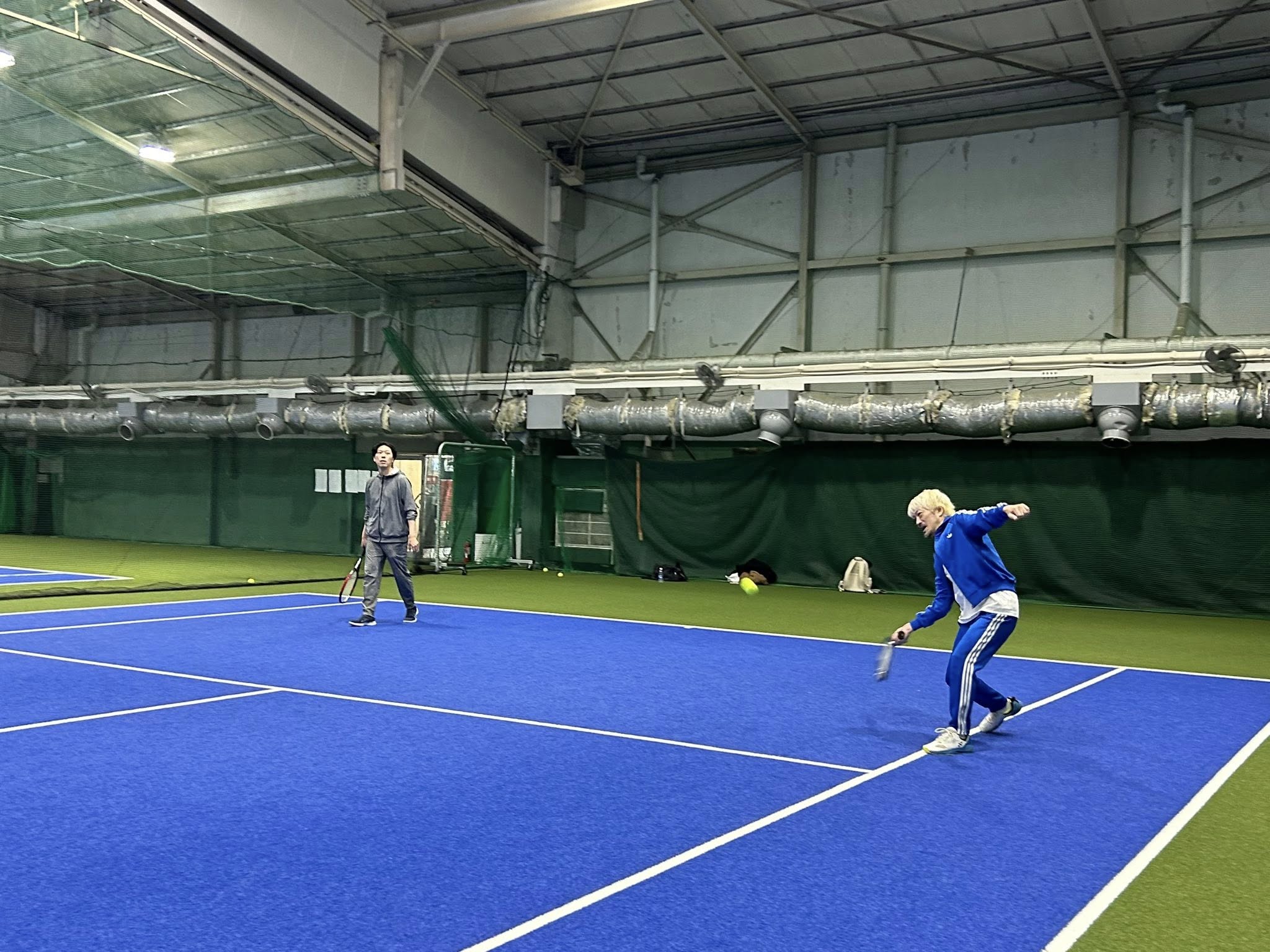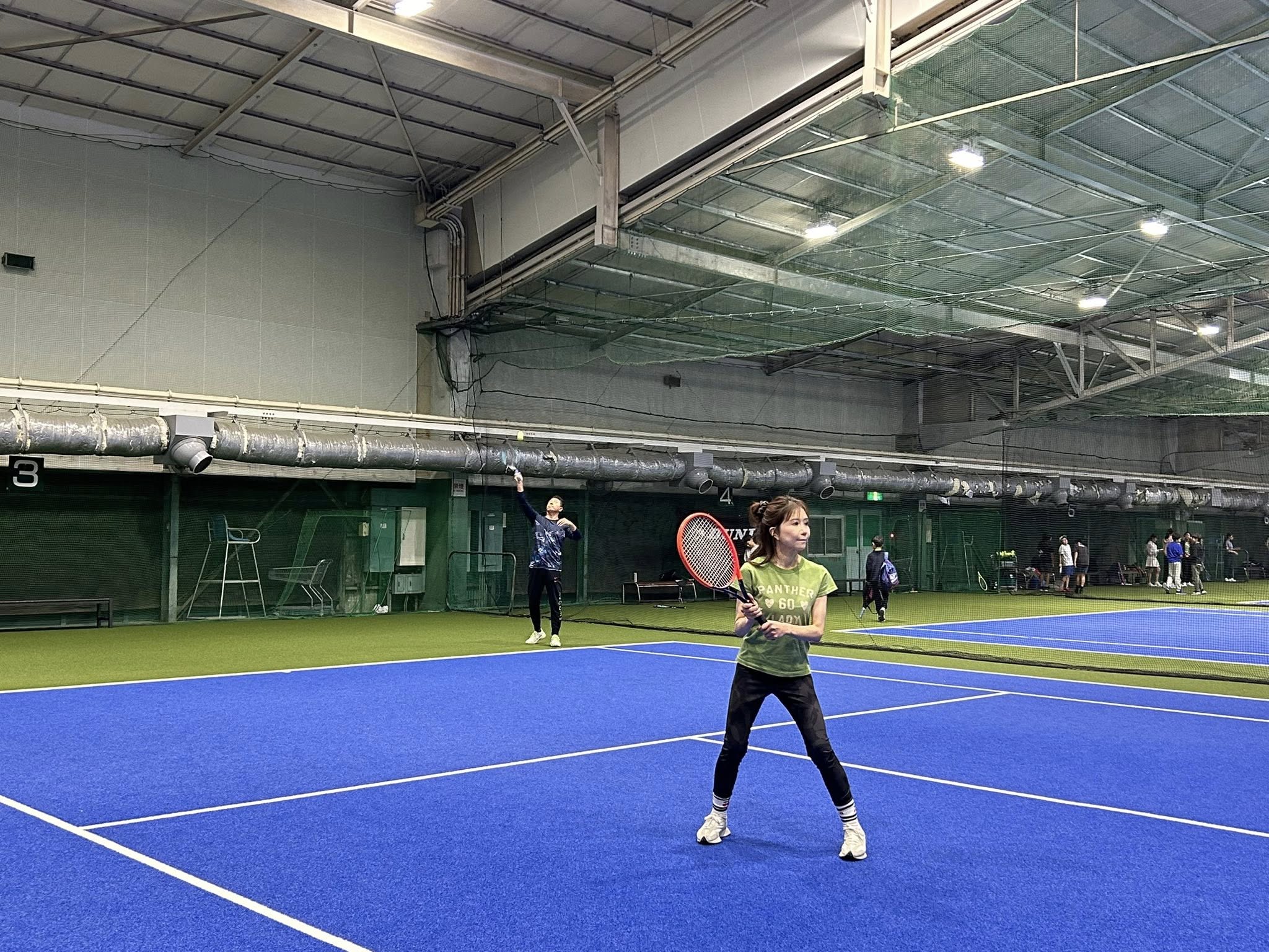 今回はテニス初心者の参加者や事務局のために、前半のウォーミングアップで城谷さんがサーブや返球のコツをご指導くださり、体が十分に温まってから試合に移りました!